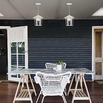 Feito no Brasil desde 1978, conta com corpo em aço, pintura a pó, lente de vidro pontilhado, soquete E27 que atende as variações de tensão entre 127V e 220V. Seu design clássico pode ser notado nos detalhes do telhado e estima acabamento que lembra telhas. Possui 1 ano de garantia.