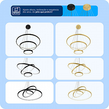 Pendente LED Ring Triplo Bivolt 60W 3.000K Dourado O Pendente LED Ring Triplo da Blumenau Iluminação traz modernidade e minimalismo para ambientes... Marca: Blumenau Iluminação Orçar Pendente LED Ring Triplo Bivolt 60W 3.000K Dourado O Pendente LED Ring Triplo da Blumenau Iluminação traz modernidade e minimalismo para ambientes sofisticados. Realça a beleza de espaços residenciais e comerciais, como salas de jantar, halls de entrada e ambientes integrados. Sua luz quente (3.000K) emitida ao longo da parte interna dos 3 aros cria uma atmosfera acolhedora e receptiva para qualquer ambiente. Versatilidade para transformar qualquer espaço: os seus aros possuem regulagem de altura de até 1,5 metros, permitindo personalização da posição de cada aro de forma individual, tornando assim o pendente único em cada ambiente em que for instalado. Possuí LED Integrado com potência total de 60W, sua lente difusora é em silicone, que assegura um conforto visual e uma distribuição de luz uniforme. Disponível nos acabamentos Preto Liso e Dourado, para coordenar com diferentes estilos de decoração. O Pendente LED Ring Triplo é a peça que transforma qualquer ambiente em um espaço memorável, unindo design inovador e funcionalidade com a assinatura de qualidade da Blumenau Iluminação.